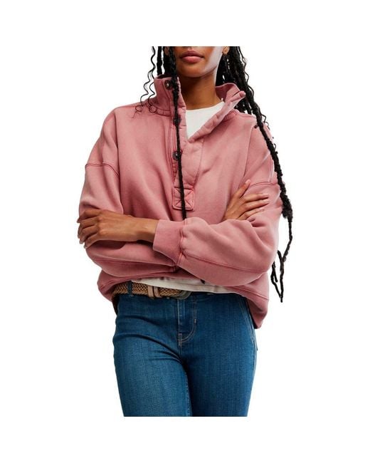 Cozy up to this cropped cotton-blend pullover made with sporty snap placket and framed by dropped shoulders for a relaxed fit. Color: red