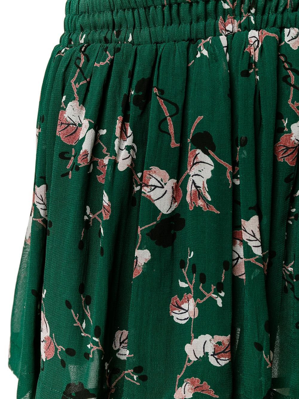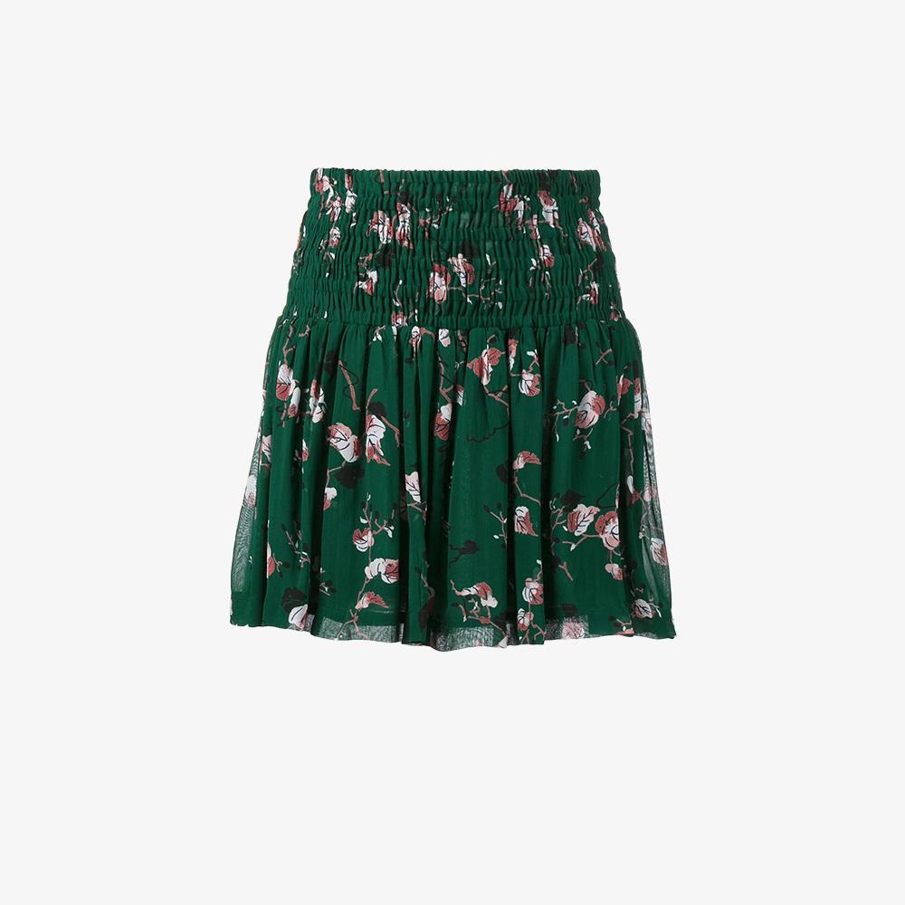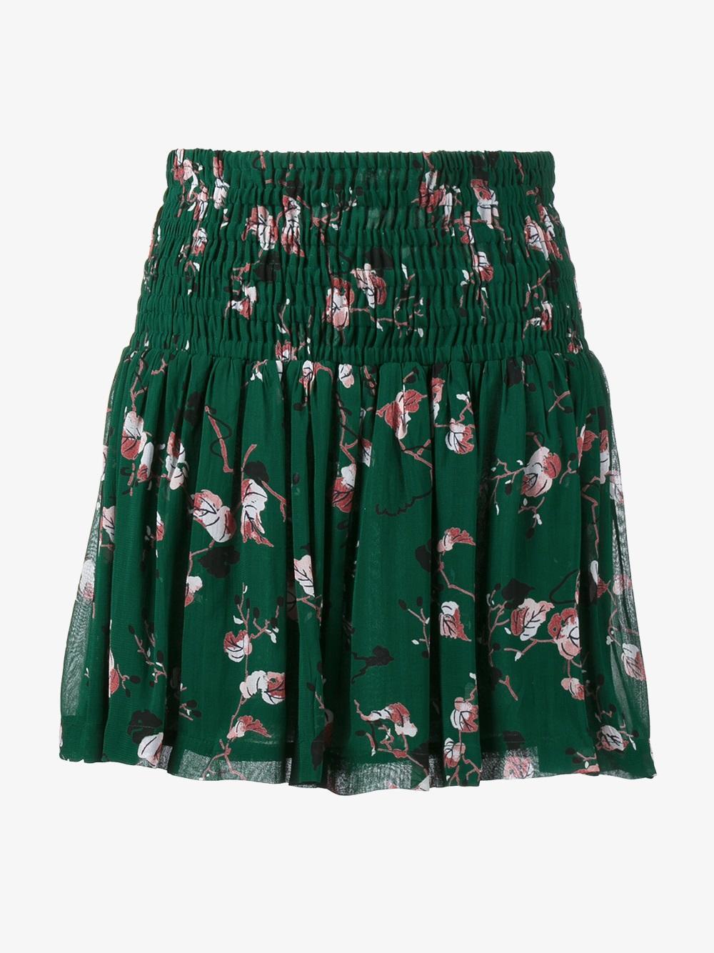 Welcome summer in style with this Pine Grove mini skirt from Ganni. Made from basil-green crepe to an A-line silhouette, it's detailed with a smocked waist and pleats while printed with white, brown and black leaves. Style it with metallic brogues and a black sweater.