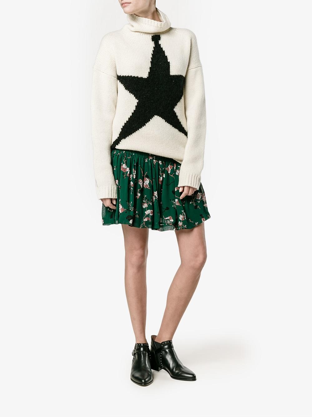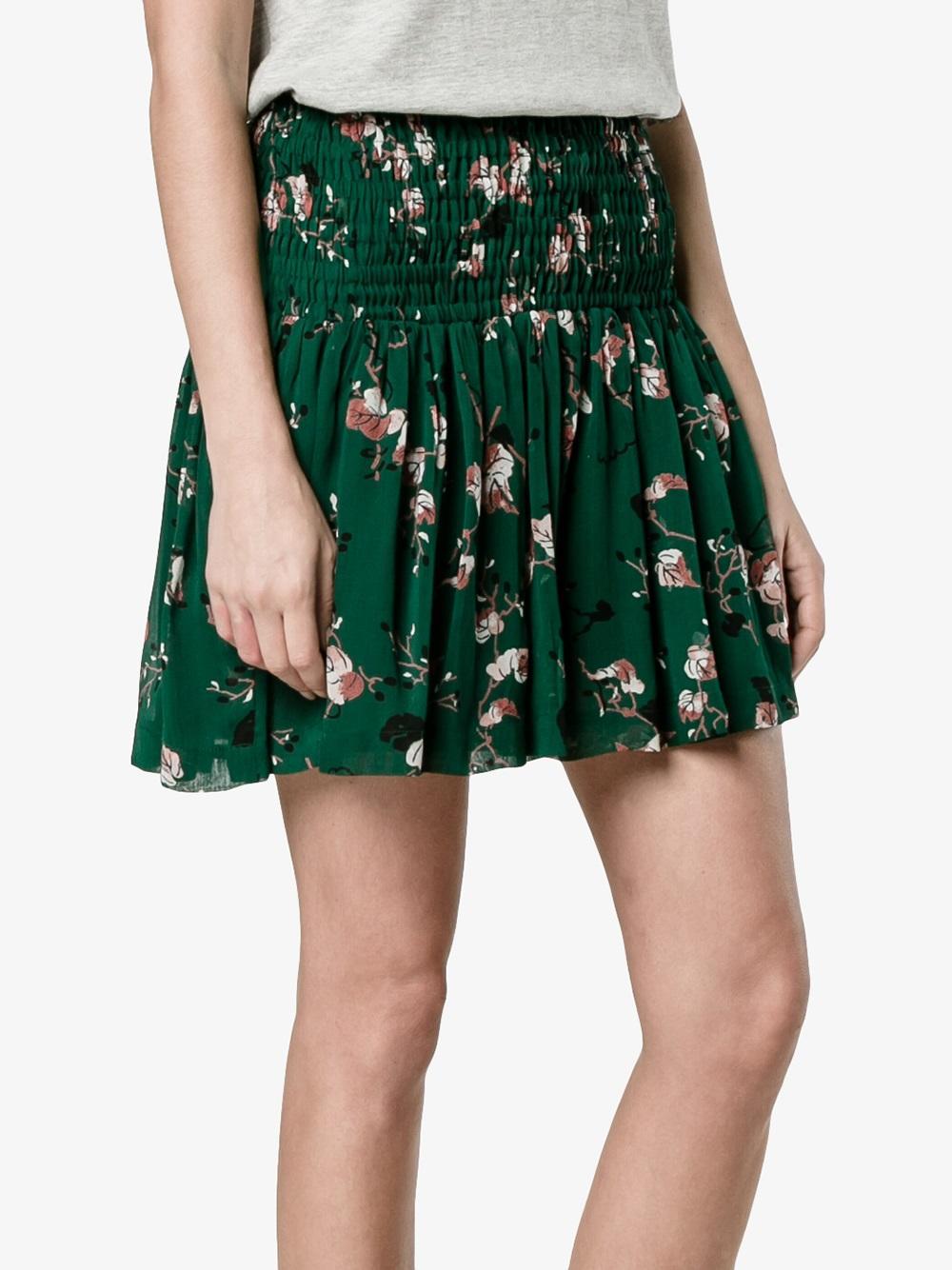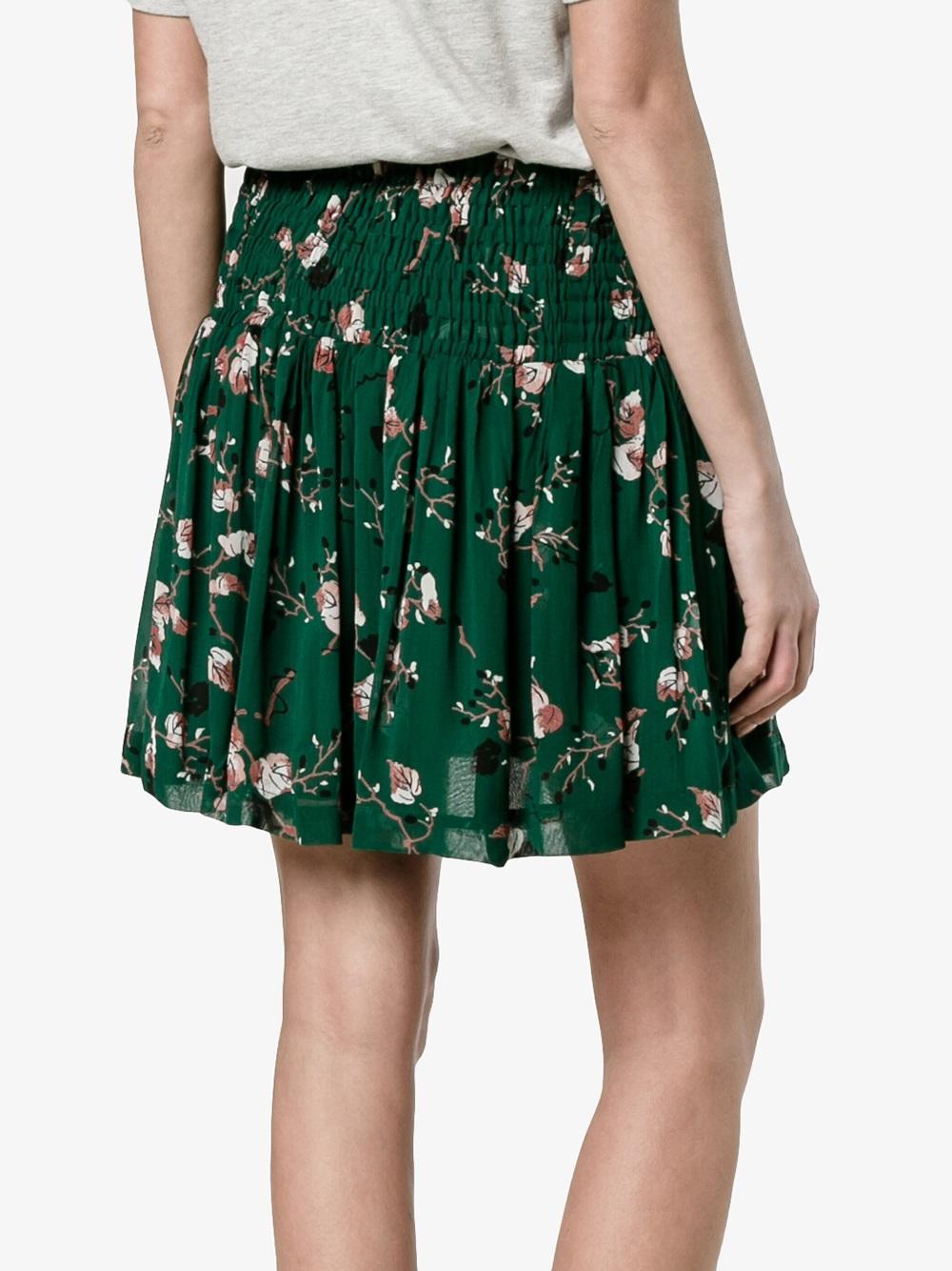 Welcome summer in style with this Pine Grove mini skirt from Ganni. Made from basil-green crepe to an A-line silhouette, it's detailed with a smocked waist and pleats while printed with white, brown and black leaves. Style it with metallic brogues and a black sweater.
