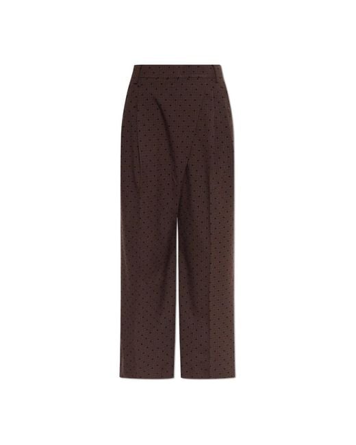 Ganni Flock Check Cross-over Pants blend a wide-leg palazzo cut with a refined flock check print for a polished, everyday closet staple. The slightly high waist and cross-over front detail create a flattering silhouette with a tailored finish. Key attributes: Chicory coffee | Polyester | Structured hand-feel | Durable fabric | Slanted front pockets | Back welt pockets | Belt loops | Hook-and-eye closure | Wide leg silhouette | Slightly high waist | Flock check pattern with black dot detail | Cross-over front detail | Minimal visible logos or embellishments | Dimensions & fit: Model height: 177 cm | Bust: 83 cm | Waist: 61 cm | Hips: 89 cm | Model is wearing size: 36 | Relaxed fit | Wide leg / palazzo cut | Slightly high waist | Composition & care: 64% polyester | 34% Viscose (Lenzing Ecovero) | 2% Elastane | Lining: 100% Cotton | Machine wash 30°C (gentle process). Do not bleach. Do not tumble dry. Iron at low temperature. Do not dry clean. Color: brown