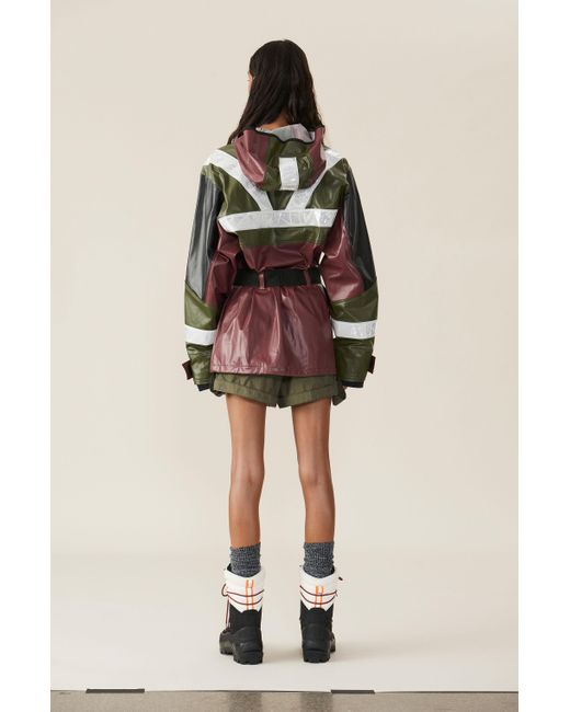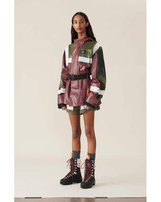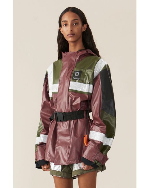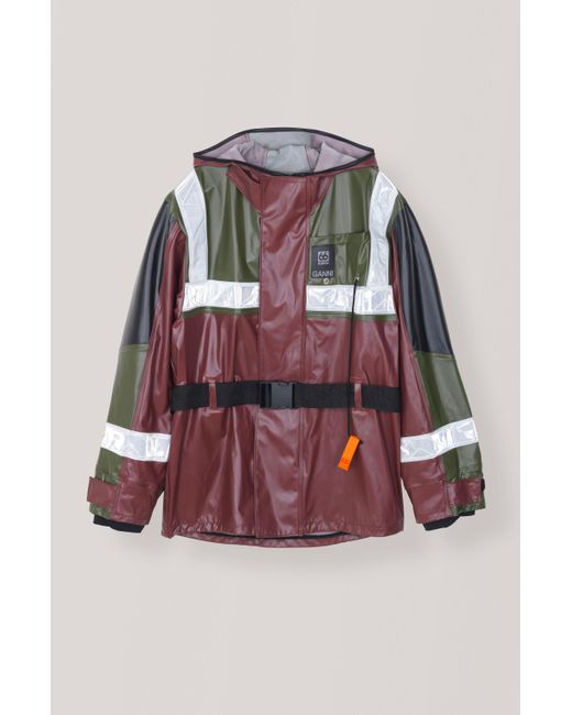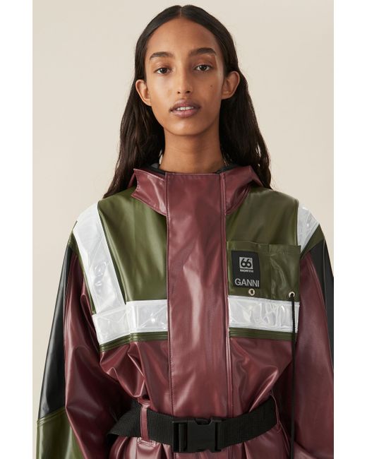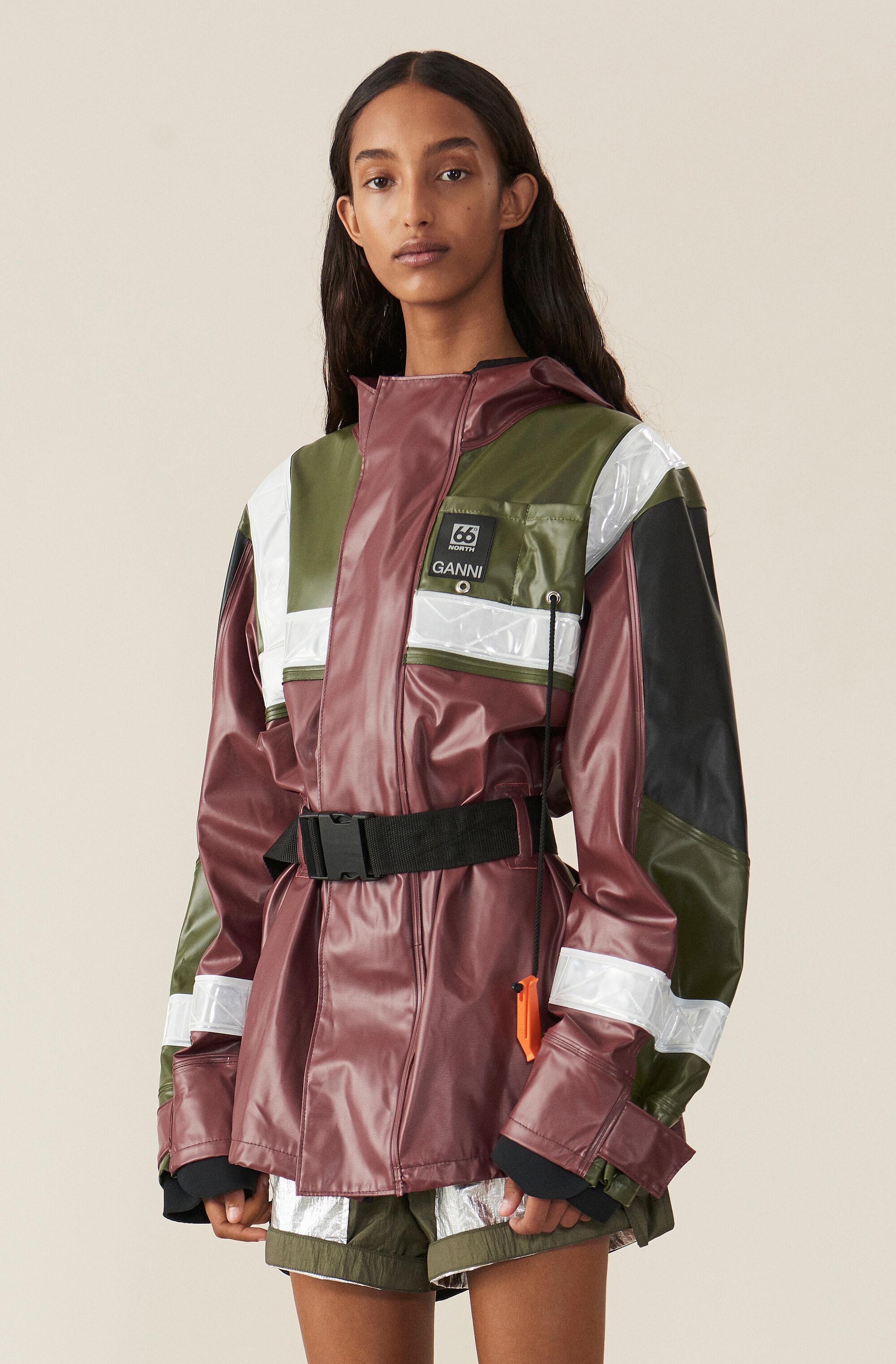 Ganni - designed in collaboration with icelandic outdoor specialist 66°north, this burgundy askja jacket from ganni's ss19 runway show draws from traditional fisherman's outerwear– note the accompanying orange emergency whistle. Constructed from waterproof shell with black and green panels, it has reflective trims and a push fastening-buckled belt that can be used to cinch the oversized shape. Wear it with sleek black separates and chunky leather boots for a directional look with a functional edge.
