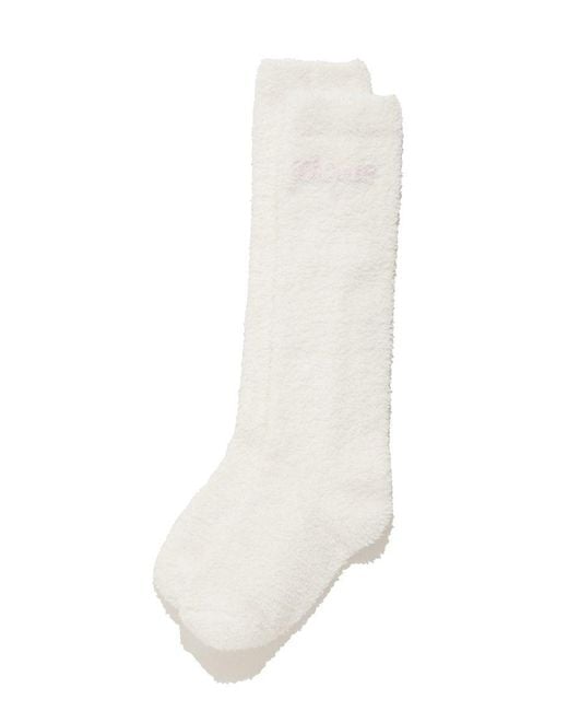 [Fluffy knit socks with a cute, large logo embroidery][Design/Styling]These calf-length socks offer a dreamy, fluffy feel with their cute color palette. The large, fluffy logo embroidery adds a catchy touch. Available in two colors: soft off-white and pink. We recommend pairing them with the Feather Knit loungewear or other valentine loungewear from the collection.