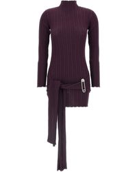 Go to TheBSMini dress in stretch ribbed merino wool blend, sash tie as desired with removable jewel metal brooch detail, high neck, long sleeves. Color: purple
