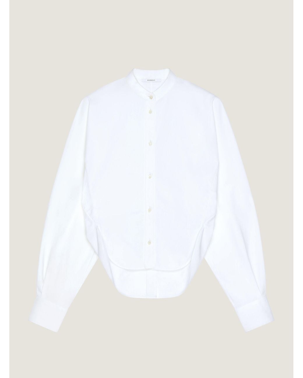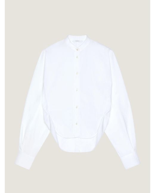 Volume is exaggerated, patterns reworked and seams inverted to shape the Cocoon silhouette.- Long-sleeved shirt in cotton poplin. - Mao collar. - Button closure. - Buttoned cuffs. - Slashed in the back. - Couture seams for a cocooning volume. Color: white