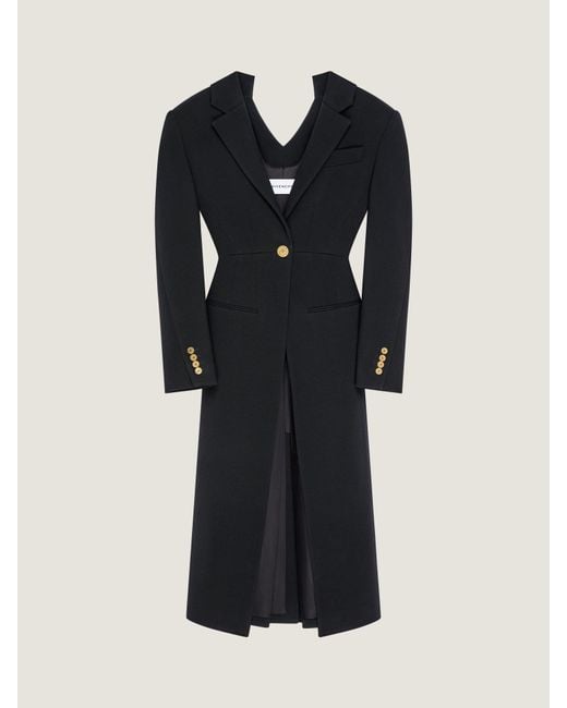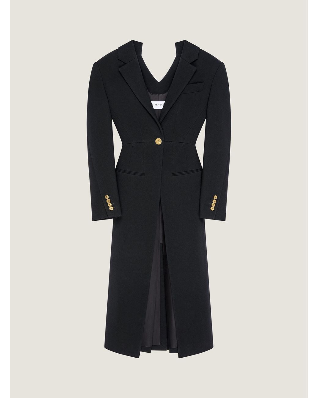 - Coat in wool. - Notch lapel. - V neckline. - Slashed in the back. - Single breasted. - Buttoned cuffs. - GIVENCHY engraved golden buttons. - One chest pocket. - Two front pockets. - Cinched waist. - Slit on the front. - Satin lining. Color: black