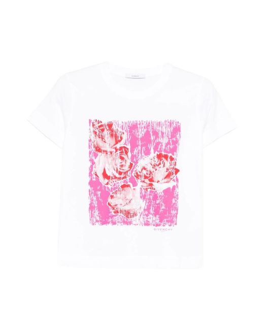 Givenchy T-shirt with flowers print features a crew neck and a painted floral motif on the front, offering a refined take on a classic tee. Key attributes: Multicolor | White | Pink | Silk & Nylon | Crew neck | Short sleeves | Painted flowers print on front | Givenchy Paris signature print | Composition & care: Silk | Nylon | Machine wash cold (max 30°C) on a delicate cycle. Iron at a maximum soleplate temperature of 110°C without steam. Do not tumble dry, bleach or dry clean. Color: pink