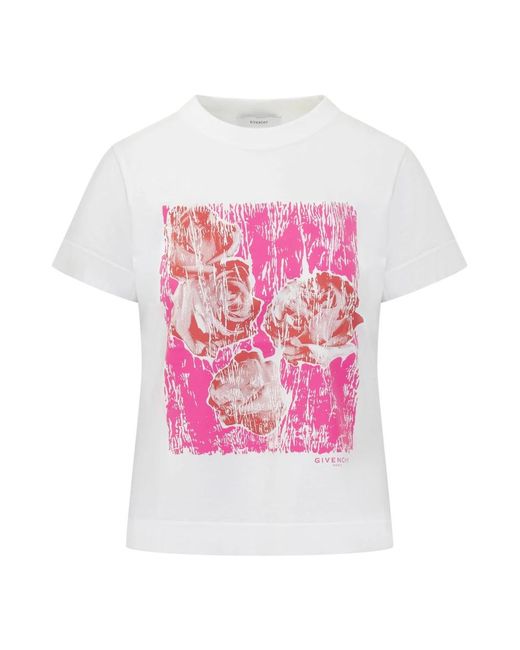 Givenchy T-shirt in cotton with flowers print features a painted floral motif on the front for a refined casual look. Wear it with denim or tailored pants for versatile everyday styling. Key attributes: White | Pink | Cotton | Crew neck | Short sleeves | Painted floral print on front | Givenchy Paris signature printed on front | Composition & care: 100% cotton | Machine wash maximum 30°C on a delicate cycle. Iron at maximum soleplate temperature (110°C) without steam. Do not tumble dry. Do not bleach. Do not dry clean. Color: pink