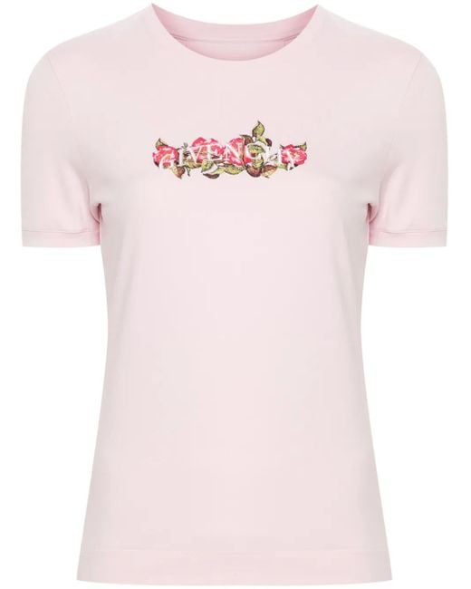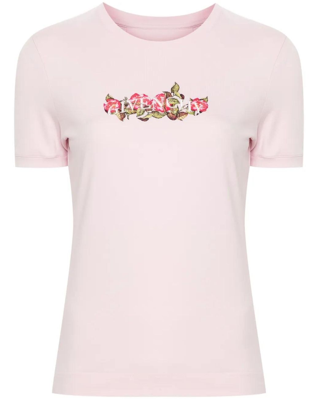 Light pink cotton blend lightweight jersey rose print to the front ribbed trim crew neck short sleeves ribbed cuffs embroidered logo to the front straight hem Size: S. Gender: Female. Material:Elastane/Cotton.