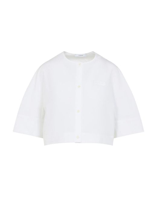 Givenchy white cotton shirt. pure white cotton shirt, round neck, front buttoned fastening, chest tonal patch logo, short sleeves, straight hem, tonal stitching, cropped design.