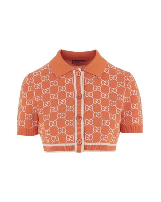 Gucci GG cotton jacquard cropped cardigan blends the house's signature GG motif with a cropped silhouette for layering. Its standout feature is the GG fine cotton jacquard that creates a statement knit suitable for smart-casual looks. Key attributes: Orange | Ivory | Cotton | Front button closure | Cropped length for layering | Point collar | Rib trim | Short sleeves | GG jacquard motif | Cropped silhouette | Dimensions & fit: Length: 14.1" | Cropped fit | Length based on size S | Composition & care: Fabric: 100% Cotton | Trimming: 87% Cotton, 12% Polyamide, 1% Elastane Color: orange
