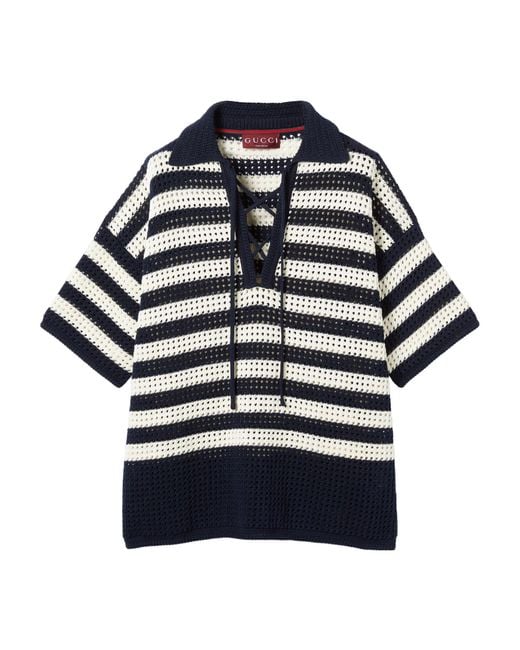 Maritime-inspired designs enrich casual silhouettes perfect for the seaside featuring stripes anchor motifs and the House logo in the Pre-Fall 2025 collection This polo shirt is presented in dark blue and white perforated striped cotton knit and reveals a self-tie neck bow on the front Dark blue and white perforated striped cotton knit Open collar Dropped shoulder Short sleeves Self-tie neck bow Made in Italy