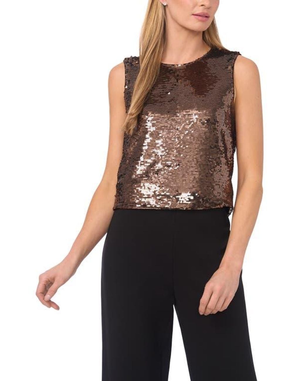 This stretch-enhanced shell top is coated in light-reflecting sequins and made in a sleeveless silhouette that's easy to layer. 21" length Back keyhole with button-and-loop closure Jewel neck Sleeveless 95% polyester, 5% spandex Hand wash, dry flat Imported