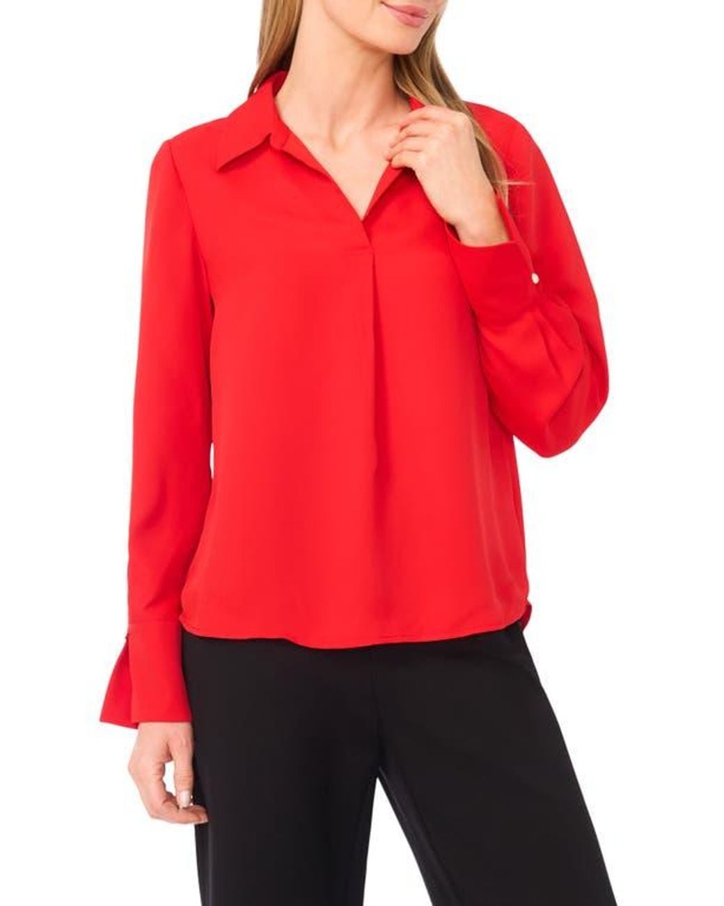 Flared cuffs with splits lend stylish shape to this lightweight button-up top that has a hidden placket for a streamlined look. 25" length Hidden-button placket Notched collar Long sleeves with one-button split cuffs 100% polyester Machine wash, tumble dry Imported