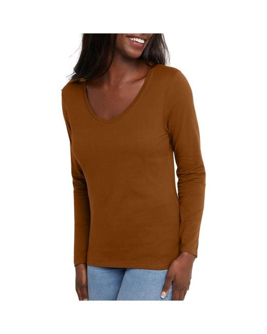 Women's Brown Originals Long Sleeve Cotton V-neck T-shirt