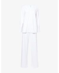 Go to MiintoHanro Claire Two-piece Pajamas combine Swiss craftsmanship with a soft cotton–modal interlock for elegant, comfortable sleep and lounging. The set pairs a longer, relaxed V-neck top with straight, slightly tapered pants, finished with