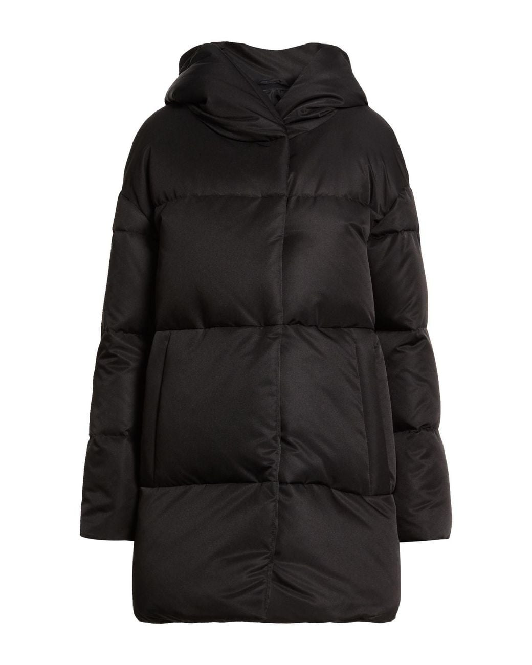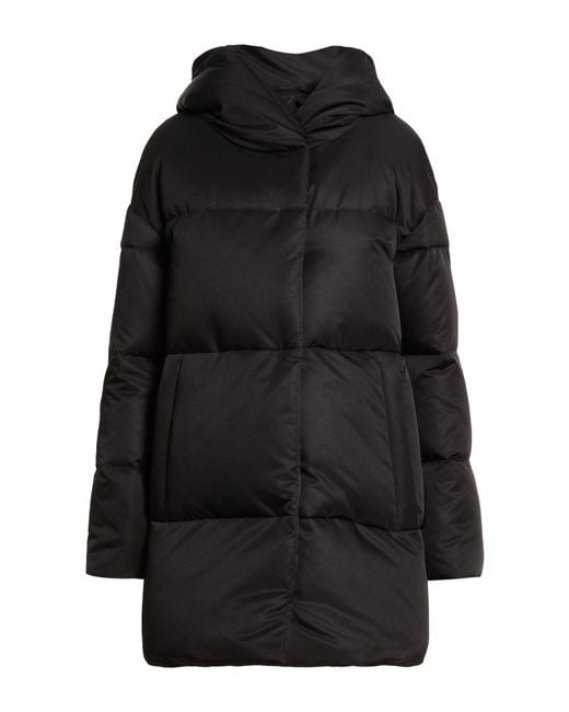 Down coat, shell, brand logo, solid color, hooded, long sleeves, goose down interior, heavyweight padding, snap fastenings, zipped pockets, contains non-textile parts of animal origin, dry clean, do not bleach, do not tumble dry , Color: Black , Size: 6