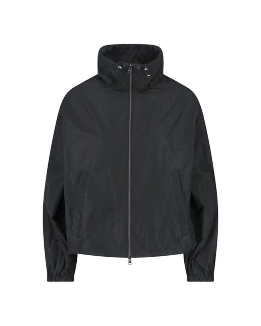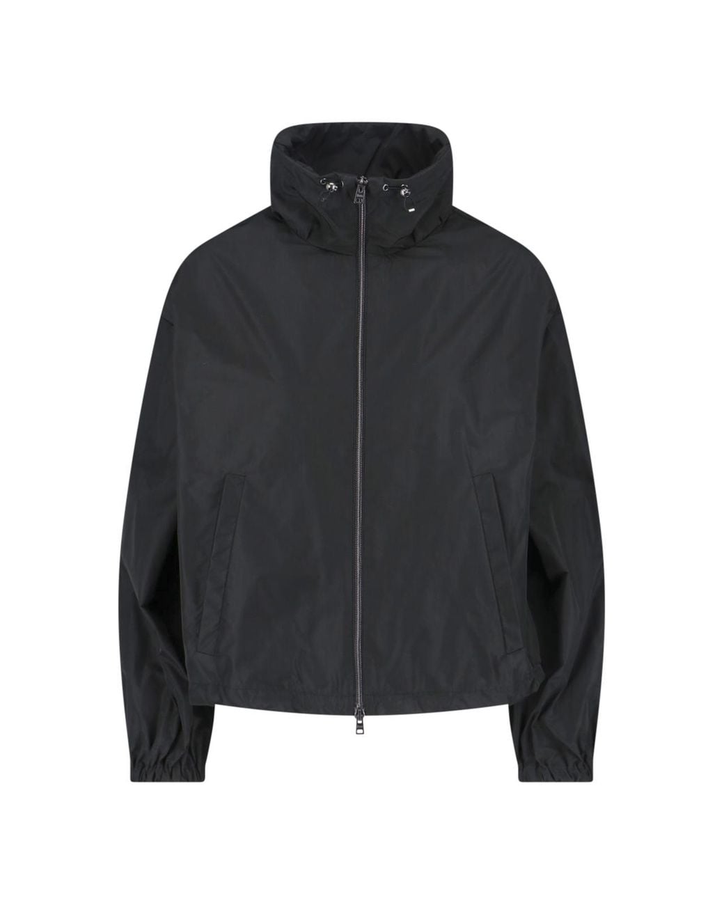 Short jacket in black lightweight technical fabric with a boxy silhouette. Center-front full-length zip fastening with a branded silver-tone zipper pull high funnel neck with concealed hood and drawcord adjustment with silver-tone toggle stoppers on both sides. Two slanted zip pockets at the lower front. Long sleeves with elasticated cuffs featuring a drawcord and silver-tone toggle stopper. Elasticated hem at the back. Small branded label sewn on the back collar. Color: black