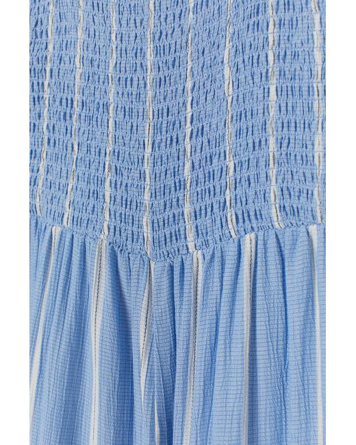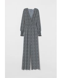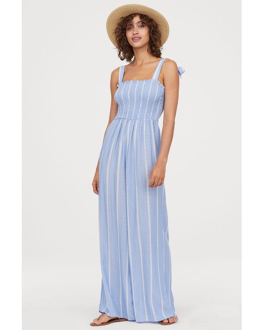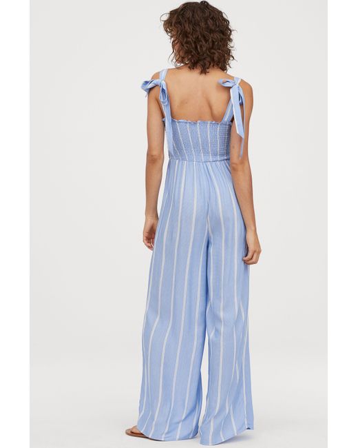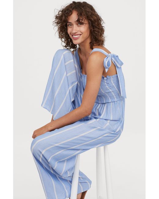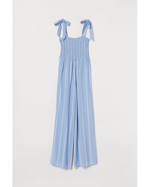 Jumpsuit in woven, crinkled viscose fabric with a smocked bodice. Wide, tie-top shoulder straps, high waist, and wide, straight legs. Unlined. Viscose 100%. Machine wash cold. Color: blue
