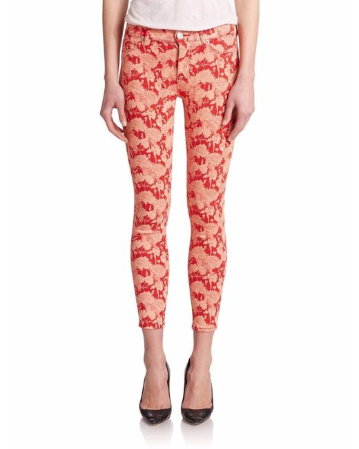 Women's Red Floral Print Nico Mid Rise Skinny Ankle Jeans