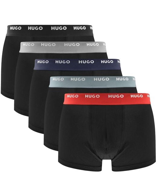 HUGO 5 Pack Trunks In Black. Cotton stretch trunks with elasticated waistbands in a mix of colors all of which feature the signature HUGO logo repeated. 95% Cotton And 5% Elastane. Color: black