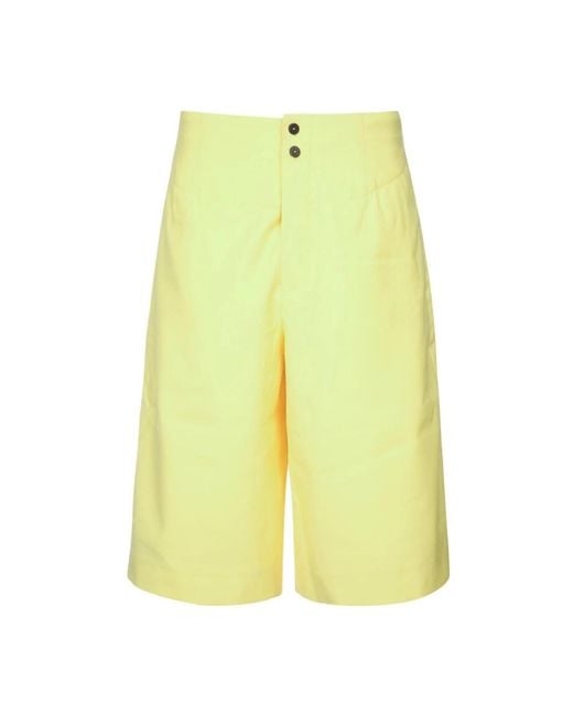 Jacquemus Le Short Moisson is a tailored Bermuda short by Jacquemus, finished in Yellow and designed for structured warm-weather wear. It pairs fluid tailoring with a fully lined interior and a twin-button fly for a polished look. Key attributes: Yellow | Wool | Buttoned fly with two visible buttons | Side pockets | Piped back pockets | Fully lined | Tailored Bermuda silhouette | Fluid tailoring | Embroidered "J" on the leg | Dimensions & fit: Mid-rise | Knee-length | Tailored fit | Composition & care: 100% wool | Lining: 100% cotton Color: yellow
