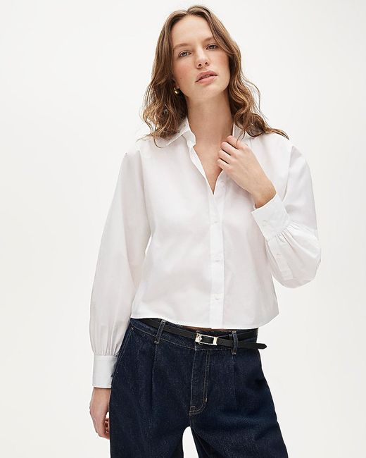 A button-down with a little extra flair. Our newest spin on the classic white shirt. This button-down features a shorter, waist-skimming length and exaggerated dolman-sleeve details with subtle volume at the cuffs. Plus, it's crafted in our crisp cotton poplin fabric for a neat, just-pressed look. Color: white