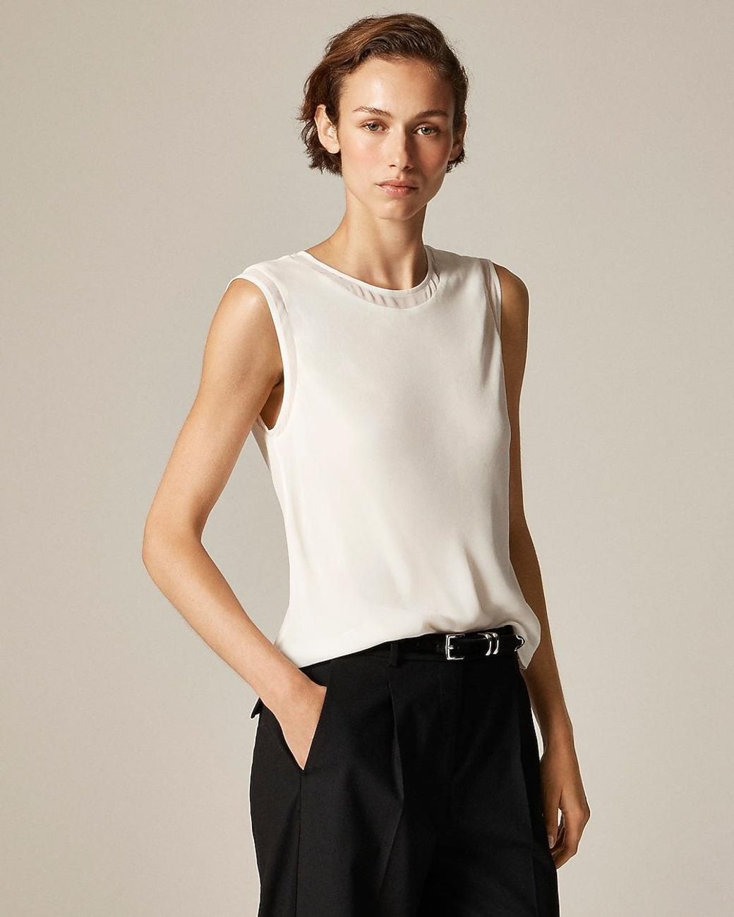 A dressier take on a throw-on-and-go. This sleeveless top is designed in an easy silhouette that feels polished enough for work but relaxed enough for everything after. Made from airy 100 percent viscose chiffon with a softly structured drape and sheer paneling details along the hem and sleeves. Color: natural