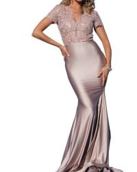 Go to ShopSimonJust add a cute little clutch and a matching heel for the perfect event look.This elegant gown features short sleeves and a fitted mermaid silhouette crafted from delicate lace. The sheer bodice adds