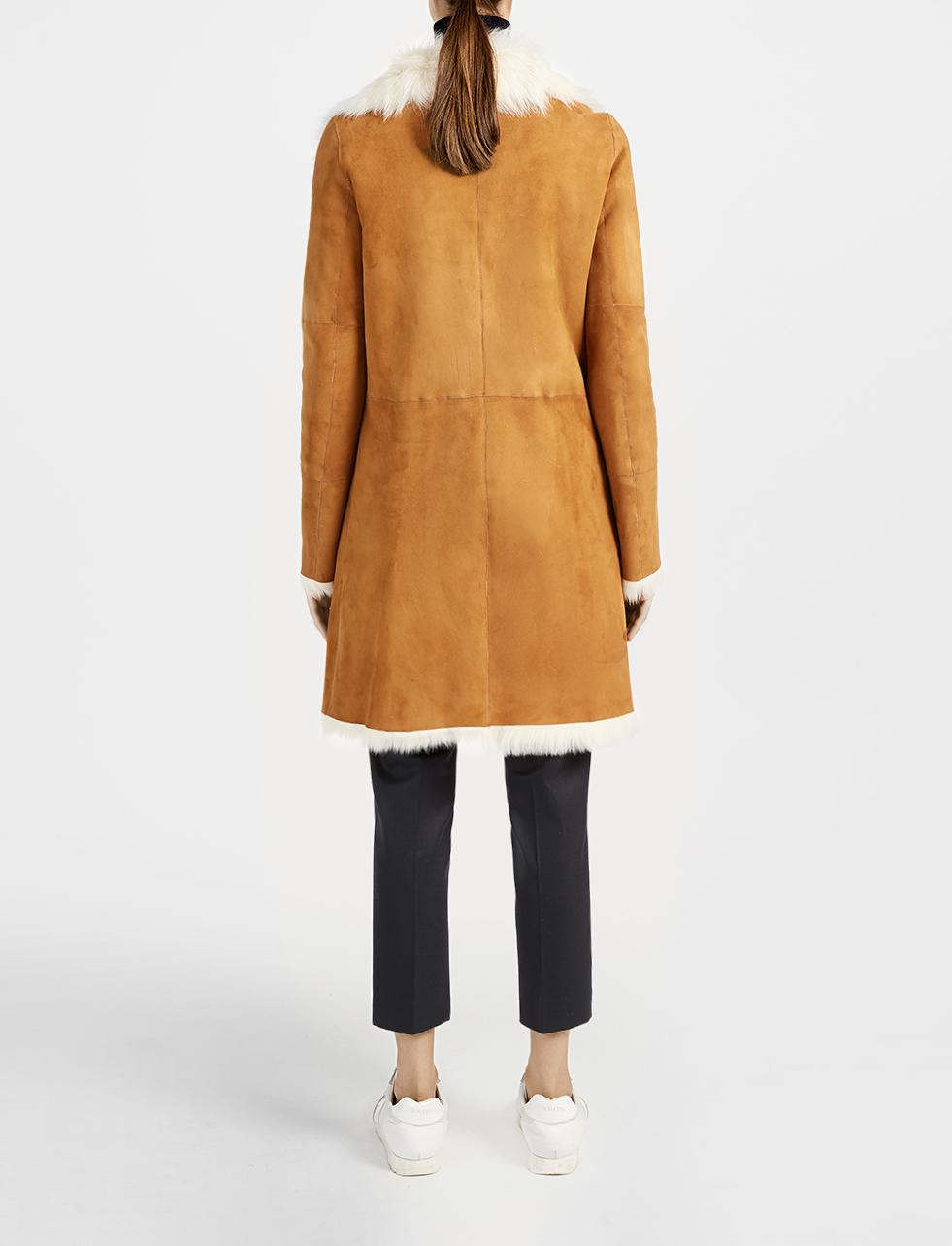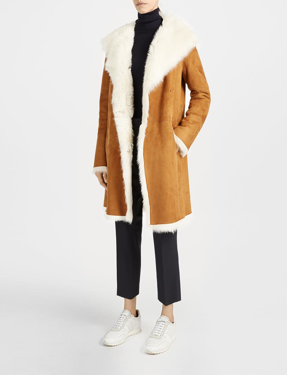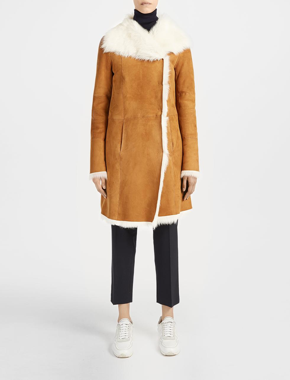 Go to JOSEPHLuxe Anais Sheepskin Coat in tan and off white with lush pelt interior and collar. A knee-length, mid-weight coat, with ultra smooth suede exterior and contrast stitched panels. With seam pockets, and full-length furrier hook fastening - a glamorous winter cover-up and the ultimate in wearability. Care: Specialist clean only. Color: brown