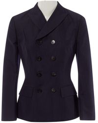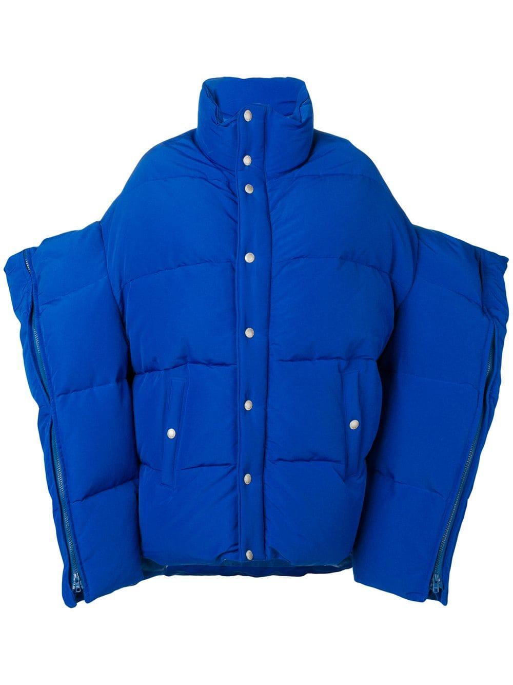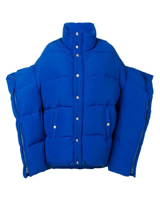 Electric blue feather down and cotton blend oversized puffer jacket from Junya Watanabe Comme Des Garçons featuring a funnel neck, dropped shoulders, zipped long sleeves, a snap button closure and front snap button pockets. Material:Polyester/Cotton/Nylon/Feather Down. This item may not be on sale in France, UK, Italy, Belgium and Switzerland. Color: blue