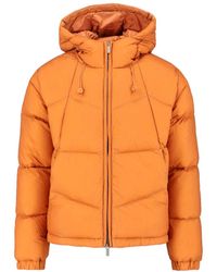 Go to ItalistK-Way "Ripstop" orange fabric down jacket with quilted and padded design, high neck, button closure and double hidden zip, multicolor details, two side button pockets, elasticated cuffs, drawstring on the hem, straight hem. Composition: 100% Polyester Color: orange
