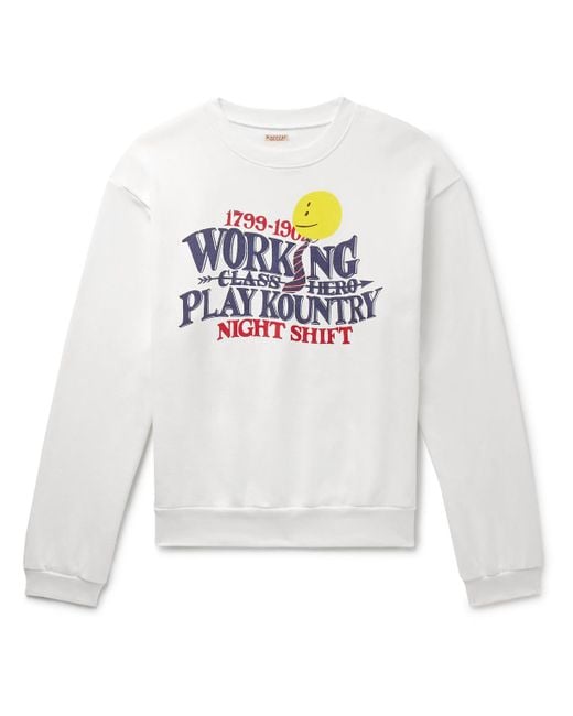KAPITAL looks to vintage Americana for design inspiration. Modeled after a retro sportswear classic, this sweatshirt has been made in Japan from loopback cotton-jersey printed with a signature 'Night Shift' graphic, inspired by the 'Working Class Hero'. Color: white