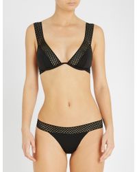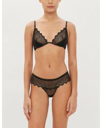 Lace trim. Mesh detail at band. Demi-cup bra. Hook-and-eye at back. Double-strap silhouette. Adjustable straps. Lightly padded cups. Lined cups. Underwire. Shell: 95% silk/5% lycra spandex. Dry clean. Made in the USA. Style #KIKII40303. Color: black
