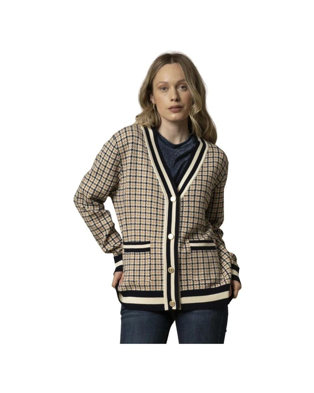 Stylish versatile checkered long sleeved sweatshirt, button up twin striped edging, integrated front pockets with matching stripes. The model is 175 cm and wears an S/42 size Color: multicolor
