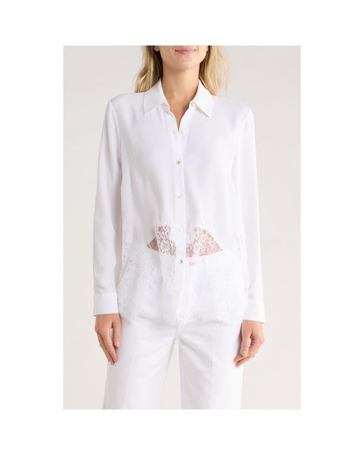 Romantic lace trim outlines the hemline of this button-up shirt cut from lightweight fabric. 28" length (size Small) Point collar Long sleeves 100% polyester Dry clean Imported Color: white