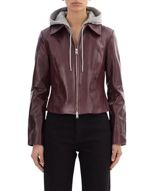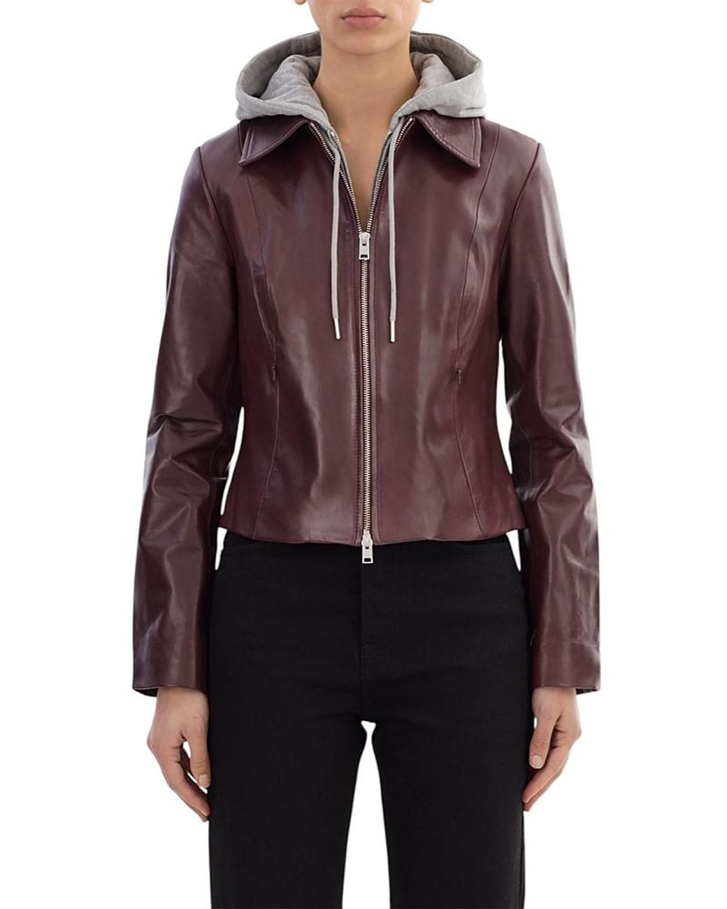 Lamarque Leather Jacket.Color:Oxblood / Heather Grey.Size:S.Material:Leather; hood: 60% polyester/40% cotton; lining: 97% polyester/3% spandex.Jackets.