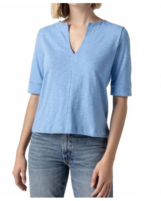 A versatile blouse that works from desk to dinner!The Lilla P Cuffed Sleeve Split Neck Top in Malibu is a minimalist staple for your summer closet. Crafted from 100% cotton with short sleeves, this solid blouse offers both comfort and style. It features a V-neckline with a pull-on closure and measures 23 inches in length for size M. Care for this garment with ease, as it is designed for machine washing in cold water. Color: blue