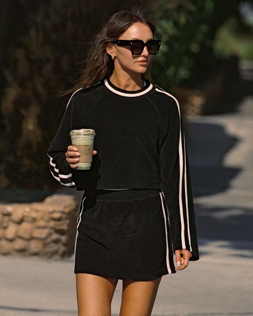 Feel the beat in the Tempo Pullover. Our activewear line just got an upgrade with the addition of this on-trend sweatshirt. A ribbed collar and colorblock detail down the arms gives it a fun and sporty feel. Pull on the matching skirt and sneakers and you'll be ready for a fit check. Crew Neckline ; Colorblock Detail On Arm; 80% Cotton, 20% Polyester; Style # ATEMPO25; Color: black