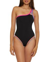 Go to NordstromColorful contrast binding gives a sporty vibe to this one-shoulder one-piece swimsuit with an open back and bright embroidery. Color: blue