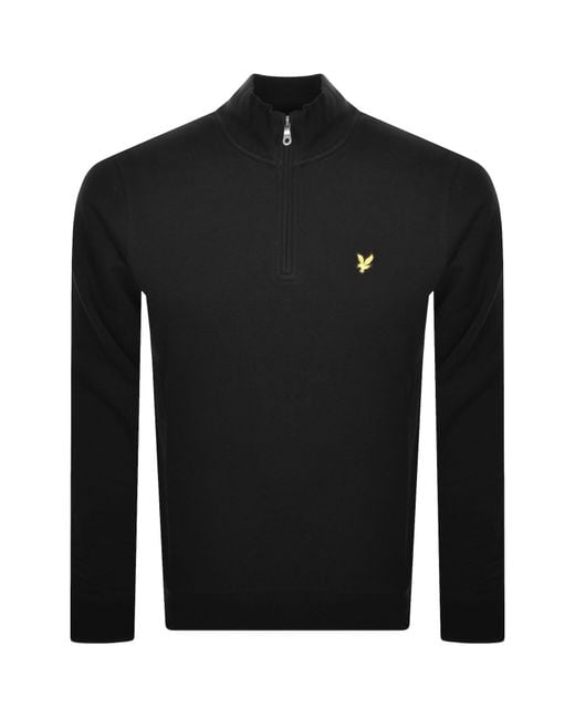Lyle And Scott Loopback Quarter Zip Sweatshirt In Jet Black. A quarter zip fastening at the neck with a stand up ribbed collar. Ribbed cuffs on the long sleeves with a stretch ribbed waistband. The signature Lyle And Scott Eagle logo is embroidered on the left of the chest in golden yellow and black. 100% Cotton. Color: black