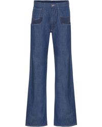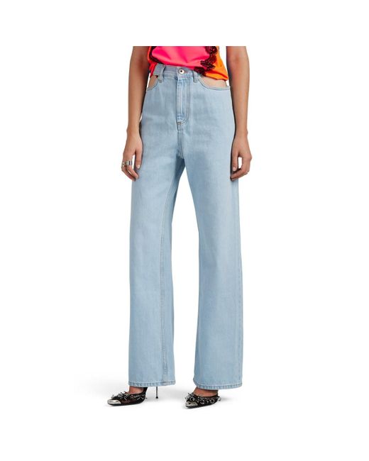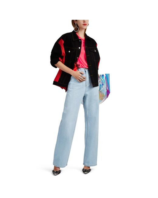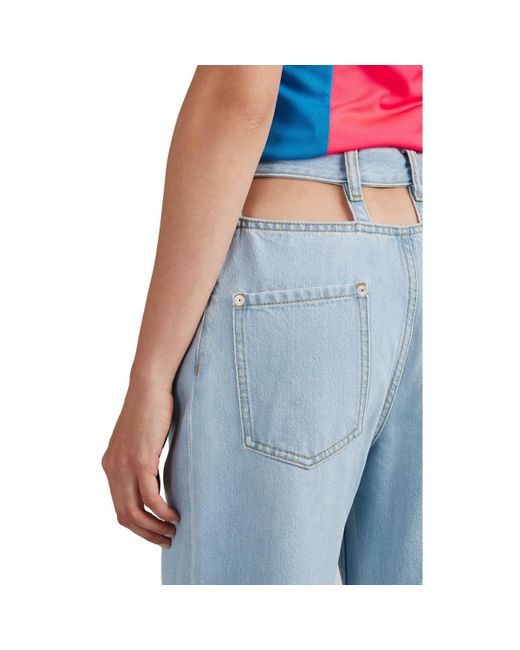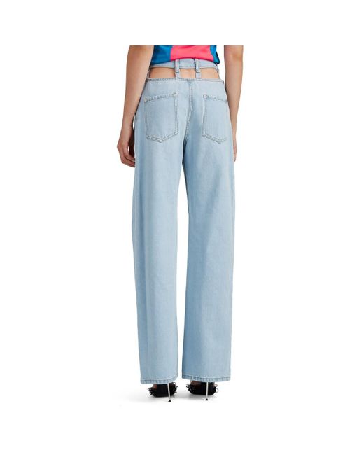 Maison Margiela's wide-leg jeans are cut from light blue cotton denim. Detailed with a cutout back waist and sides, this pair references the avant-garde approach of the French house. Signature white basting stitches at back. Sits above waist. Relaxed through hips and thighs. Two patch back pockets. Belt loops. Cutout sides and back waist. Marigold topstitching. Silvertone hardware. Zip fly. Button closure. 100% cotton. Pocket lining: 100% cotton. Machine wash. Made in Italy. Maison Margiela Women's Cutout Wide-Leg Jeans - Lt. Blue Size 42 IT A great designer gift. Shop Maison Margiela at Barneys New York. Color: blue