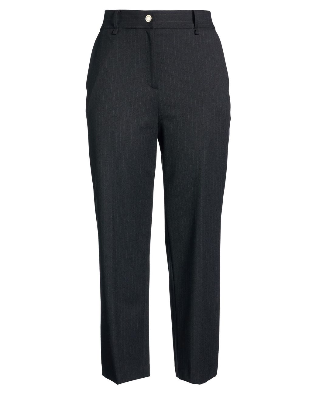 Straight-leg pants, crepe, stretchy fabric, pinstriped, no appliqués, low-crotch, belt loops, relaxed fit, zipper fastening, button fastenings, slit pockets, machine wash or dry clean, do not bleach, do not tumble dry , Color: Black , Size: 10