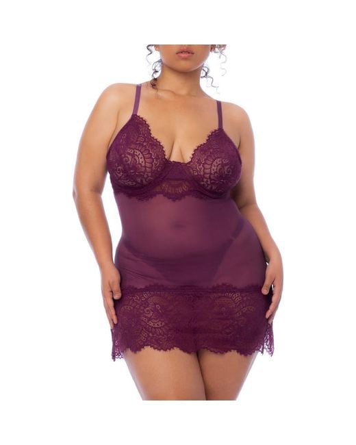 Women's Purple Lace Trim Babydoll Chemise & G-String Set