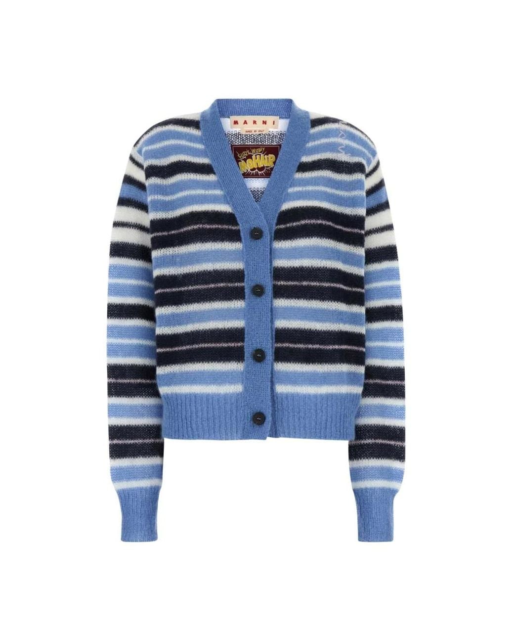 Elevate your style with this multicolor mohair blend cardigan from Marni, perfect for the fashion-forward shopper. This cardigan combines vibrant colors with luxurious materials for a standout piece in any closet. Key attributes: Multicolor | Mohair Blend | V neckline | Partial buttons closure | Ribbed cuffs and hemline | Dimensions & fit: Regular fit | Composition & care: 67% Mohair | 28% Polyamide | 5% Wool | Dry clean only Color: blue