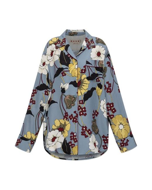 Marni Patterned Shirt pairs a large-scale floral print with a loose, classic cut for an elegant yet relaxed silhouette. Crafted in lightweight viscose, it offers a soft drape and subtle sheen for versatile day-to-evening wear. Key attributes: Multicolor | Viscose | Lightweight | Soft hand | Delicate sheen | Fabric-covered buttons | Left chest patch pocket | Traditional collar | Long sleeves | Subtly rounded hem | Large-scale floral print | Dimensions & fit: Model height: 177 cm | Bust: 83 cm | Waist: 61 cm | Hips: 89 cm | Model wearing size 40 | Loose fit | Classic cut | Composition & care: 100% viscose | Dry clean only. Do not bleach. Do not tumble dry. Color: blue