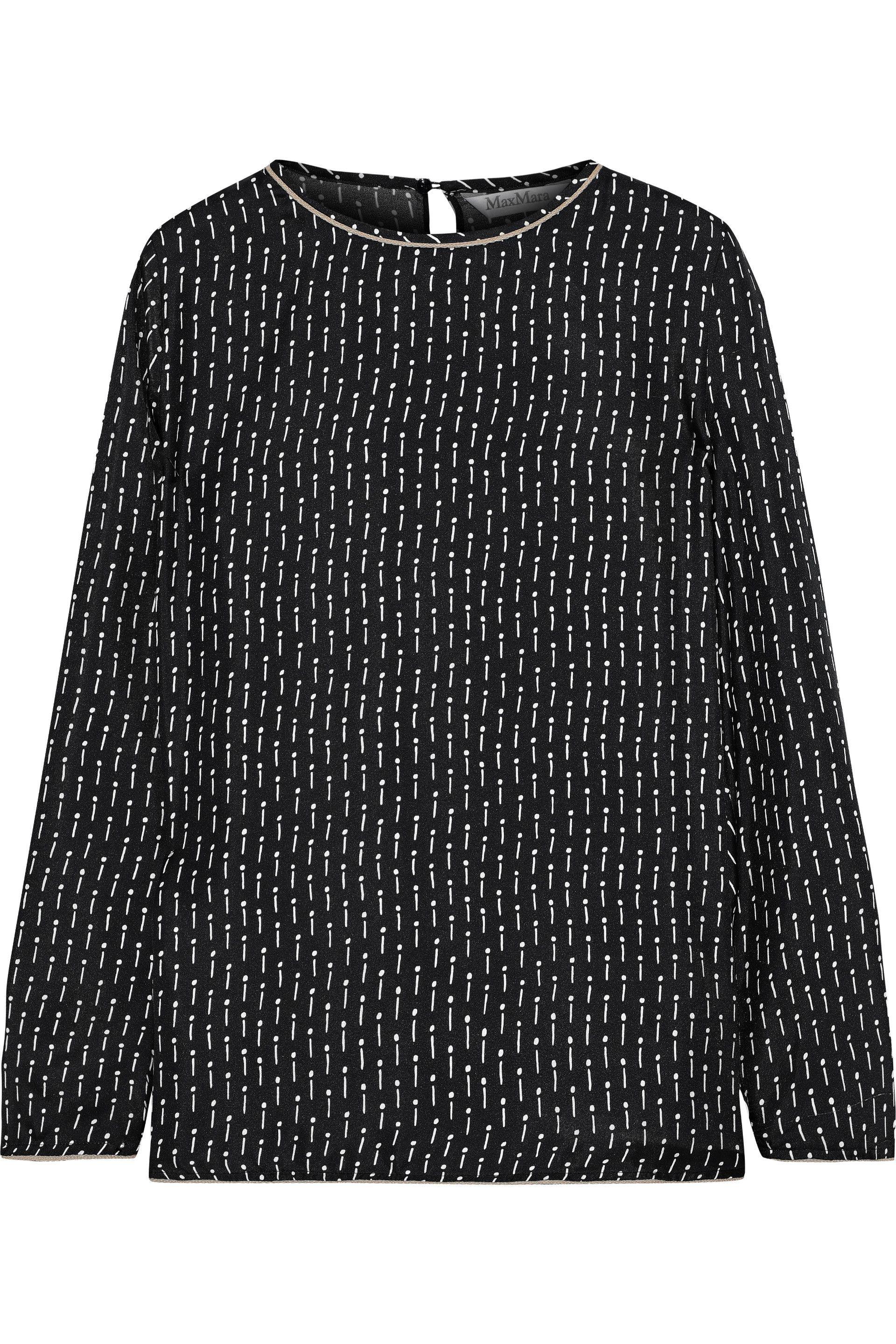Top Printed Twill Silk Button-fastening keyhole at back Side slit hemline Non-stretchy fabric Lightweight fabric Dry clean. Made in Italy Metallic trim. 100% Silk. Color: blue