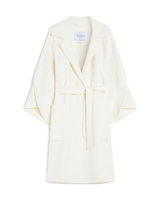 Midi robe coat featuring loose-fitting raglan sleeves with button-up detail Coat in hand-sewn double-faced lightweight wool and cashmere cloth Lapel collar Patch pockets Matching waist belt Central rear slit Unlined model Fabric 90 virgin wool 10 cashmere - except joining thread Do not wash do not bleach do not tumble dry cool iron professionally dry clean perchloroethylene - mild process do not wet clean Distributed by Max Mara S r l registered office in Reggio Emilia Italy Via Giulia Maramotti 4 42124 IT Color: white