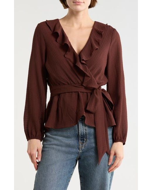 Women's Brown Ruffle Long Sleeve Faux Wrap Top