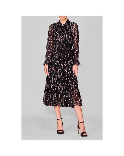Women's Black Tie Front Long Sleeve Tiered Midi Dress