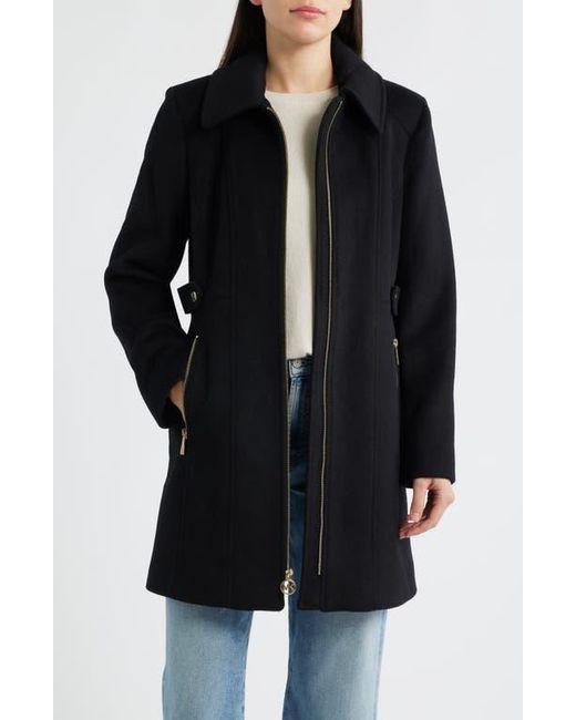 This full-of-polish coat is made in a warm wool blend and accented with high-shine hardware. Color: black